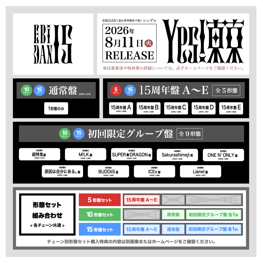一人一人が多種多様で特別な個性を持ち、夢に向かって突き進むEBiDANメンバーによってパフォーマンスされる「Yes! 東京」は、多様性と夢を全肯定し、聴くものを笑顔に、そして幸せにするEBiDANの新たな代表曲となる。シングルは通常盤・各グループ盤・15周年記念盤を合わせた全15形態でリリースされ、カップリングには、昨年の『EBiDAN THE LIVE 2025 HOTEL NINE STAR』でも披露された「好きだから走れ!!!!!!!」を収録。さらに各グループ盤には、それぞれのメンバーで歌唱された「Yes! 東京」のグループVer.を、15周年限定盤は「Yes! 東京」のRemixを収録。本日より予約受付がスタートし、封入特典や各CDショップ別特典、シリアルナンバーに関する情報も発表されている。